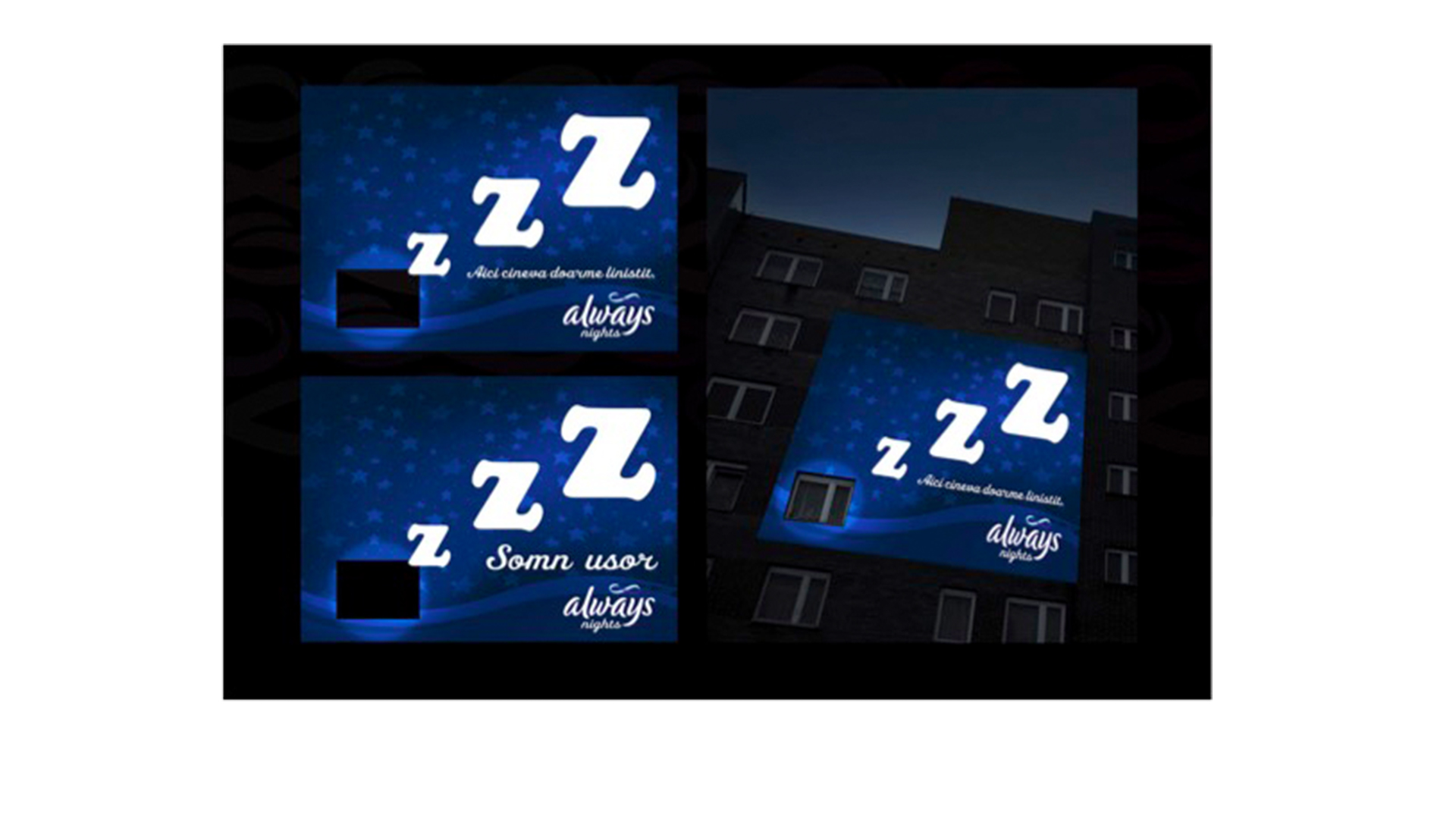 Always: 'Sleep tight' The brief: Communicate the night pads range. The approach: In order to communicate extra protection during the night, we used glow-in-the-dark paint so the message during the day will change into another one at night. Date: 2009 • Client: P&G Romania • Role: Copywriter • Tags: innovative, special outdoor •